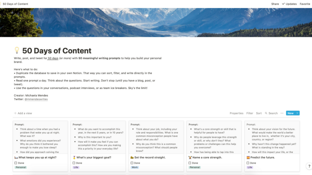 Notion Database with 50 Prompts for 50 Days of Content